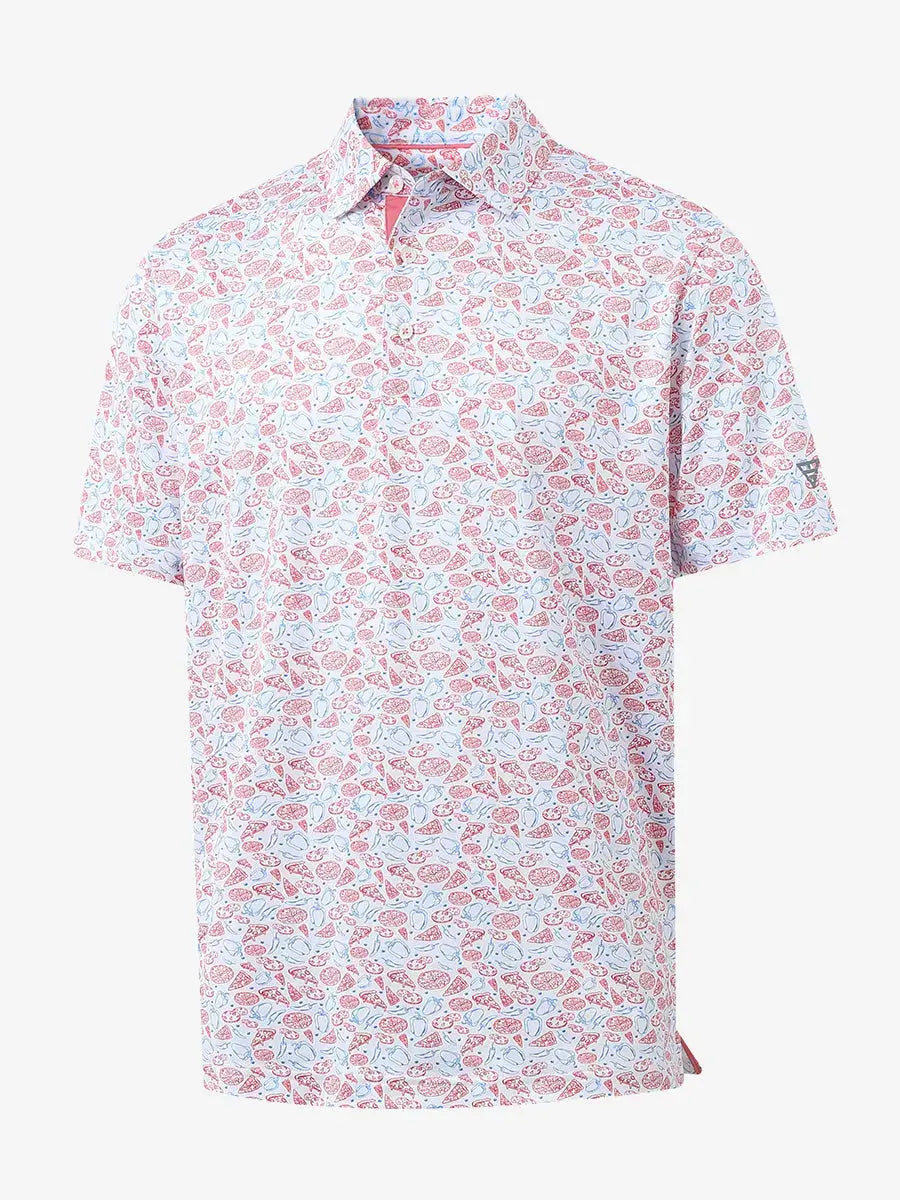 My Son loves this polo which is made of a great polyester material which isn't of thickness, it's lightweight and great for hot summer days! There is a little stretch to it. He loved the color print quality with the white background. The shirt is very easy to care for. Cold water on the gentle cycle and I hang to dry. No wrinkles. My son likes his shirts loose. A medium was perfect. I highly recommend this polo! The price was great! I would definitely purchase more if he is in need. A great buy for great quality!