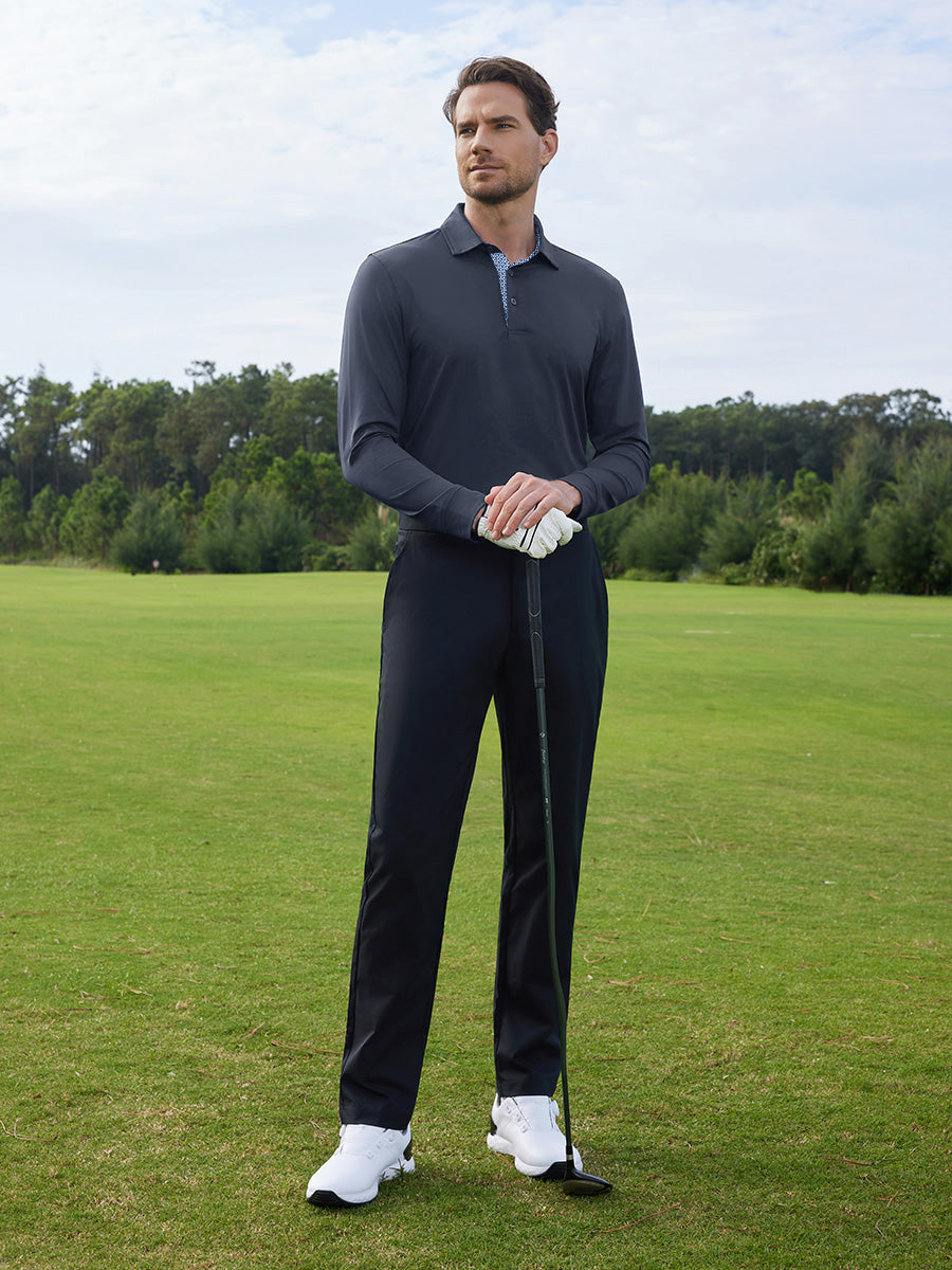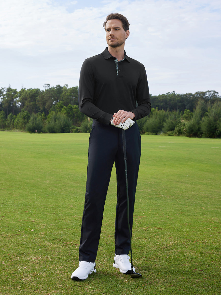 Stay cool and comfortable in our Long Sleeve Solid Jersey Polo. Crafted with moisture-wicking, quick-dry fabric that offers UPF50+ protection, a soft feel, and 4-way stretch for ultimate breathability. Our men's casual shirts feature a plain jersey design with a stylish contrast print inside the collar and placket, ensuring a fancy and comfortable look all day long.