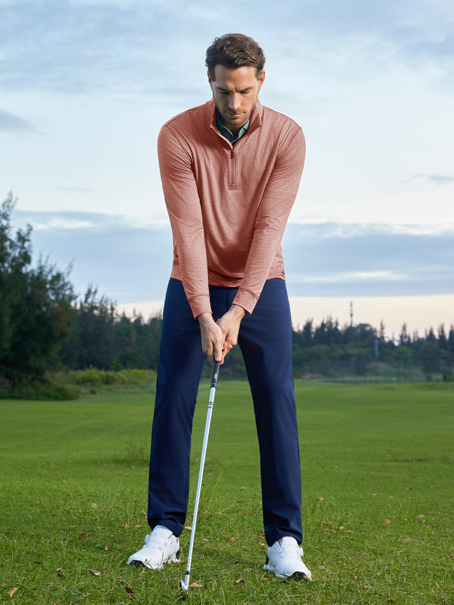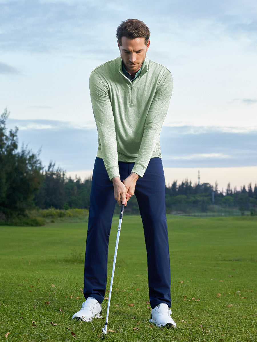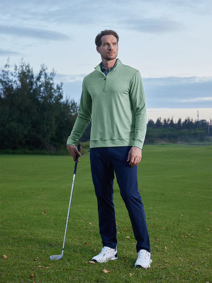 Conoce nuestro Quarter Zip Melange Pullover, la elección definitiva para los aficionados al golf. Esta sudadera para hombre tiene todo que ver con el estilo y el rendimiento, con una elegante solapa con cremallera de un cuarto con una solapa a prueba de viento para un toque moderno y un fácil control de la temperatura. Confeccionada con un tejido de punto cepillado elástico en 4 direcciones de alto rendimiento de poliéster y spandex, ofrece comodidad que absorbe la humedad, es liviana y transpirable, lo que garantiza que te muevas con facilidad y estilo en el campo de golf. ¡Eleva tu juego con comodidad y sofisticación!