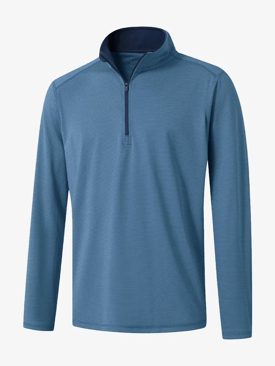 Nuestro sudadera de golf para hombre con cremallera de un cuarto está confeccionada con poliéster a rayas teñido de hilo de alta calidad, que ofrece absorción de la humedad, transpirabilidad, protección UPF30+ y elasticidad en 4 direcciones para una comodidad máxima. El diseño elegante presenta una cremallera de 1/4 para facilitar su uso y un cuello simulado para protección UV y calidez. Ideal para actividades al aire libre y rendimiento atlético.