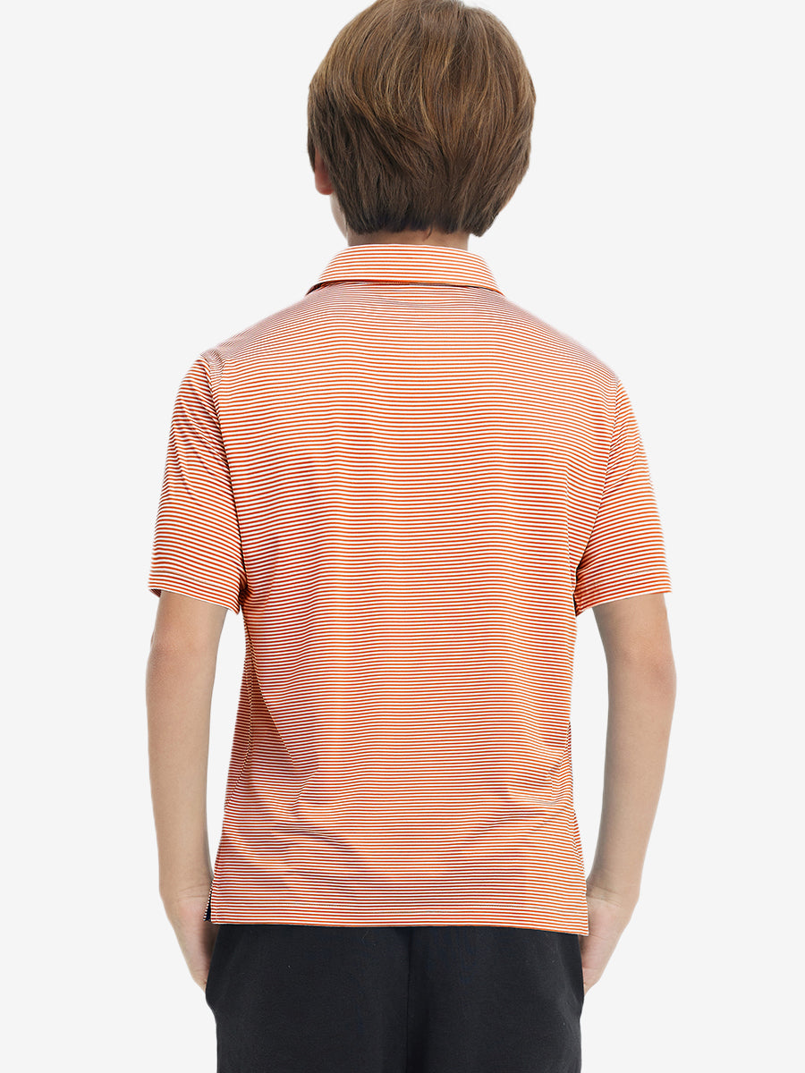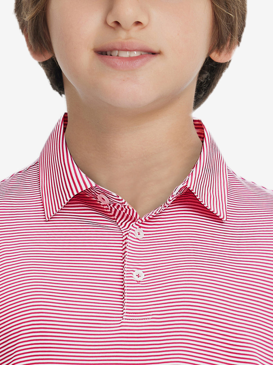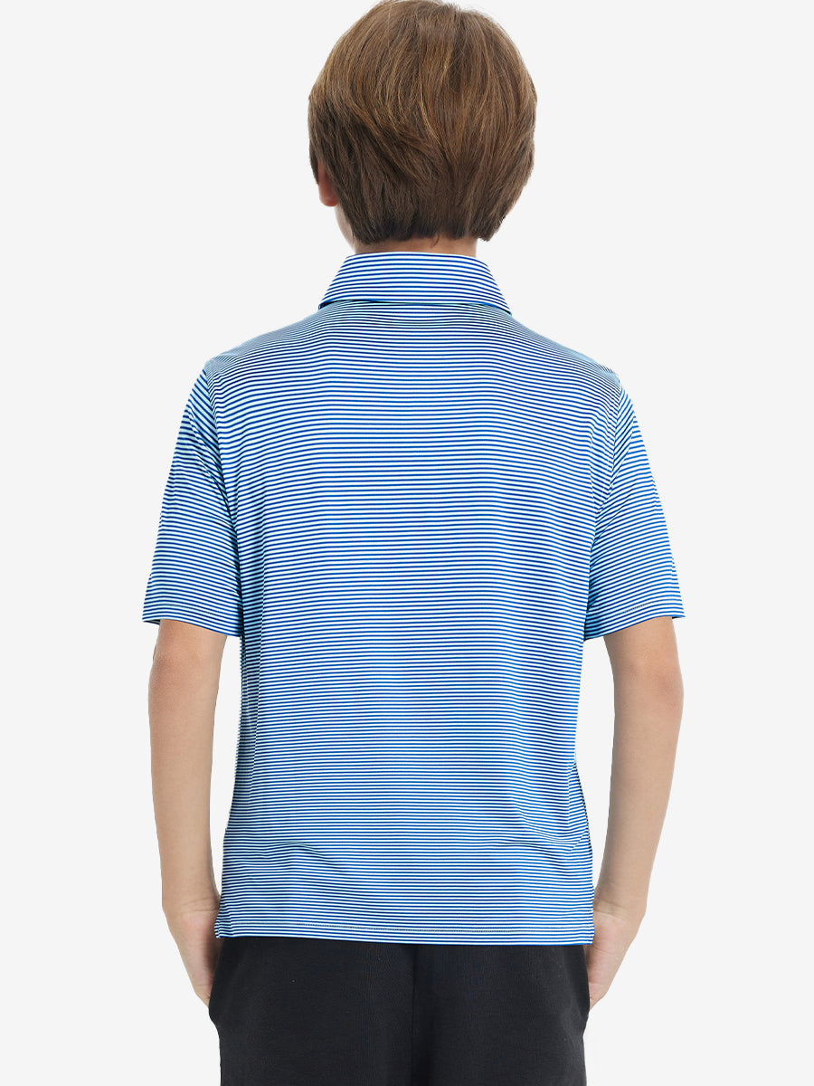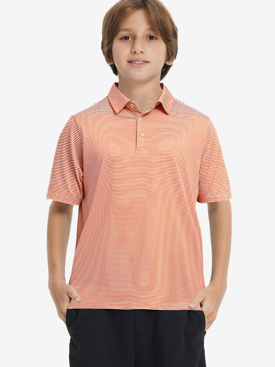 Kids Stripe Golf Polos crafted from polyester spandex striped jersey. Lightweight, moisture-wicking, quick-drying, UPF 50+, soft hand-feel, 4-way stretch for comfort and breathability. Special construction ensures a no-curl collar and maintains shape.