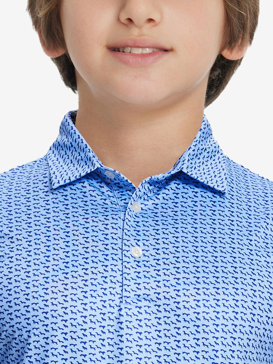 Get your little golfer ready for adventures with our 'Performance Print Boys Golf Polo.' Crafted from top-notch fabric that wicks moisture, stays light, and shields with UPF 50+. Let him swing freely with the split hem and stretchy fabric. Watch him rock the course in fun animal and plant prints that never fade, making him the cutest golfer around!